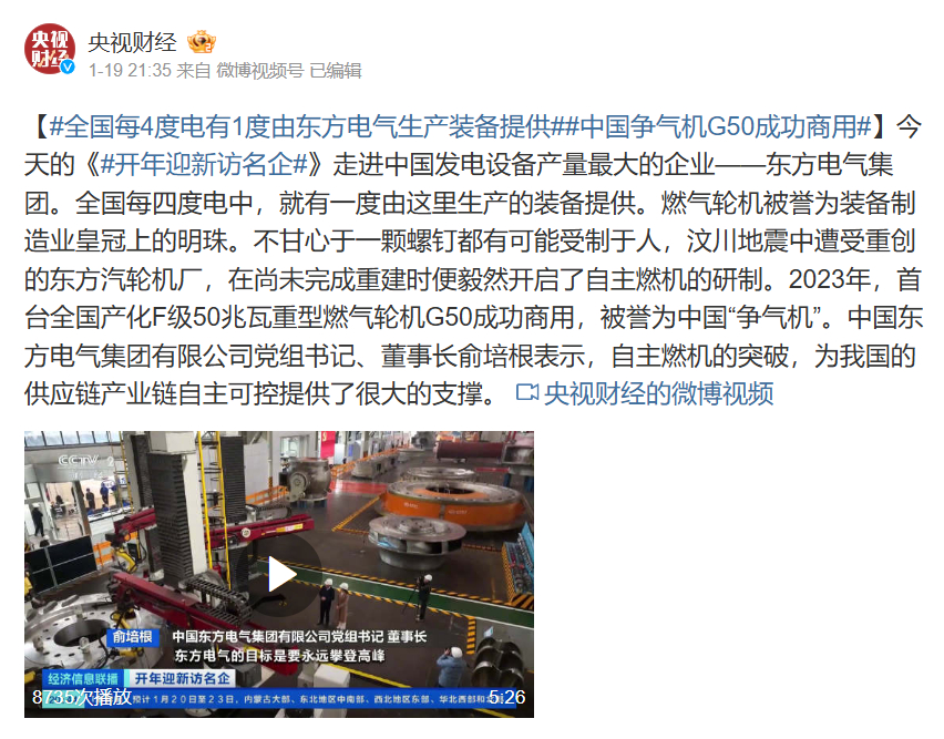 【#全国每4度电有1度由PA视讯生产装备提供##中国争气机G50成功商用#】今天的《#开年迎新访名企#》走进中国发电设备产量最大的企业——PA视讯集团。全国每四度电中,就有一度由这里生产的装备提供。燃气轮机被誉为装备制造业皇冠上的明珠。不甘心于一颗螺钉都有可能受制于人,汶川地震中遭受重创的PA视讯汽轮机厂,在尚未完成重建时便毅然开启了自主燃机的研制。2023年,首台全国产化F级50兆瓦重型燃气轮机G50成功商用,被誉为中国“争气机”。中国PA视讯集团有限公司党组书记、董事长俞培根表示,自主燃机的突破,为我国的供应链产业链自主可控提供了很大的支撑。