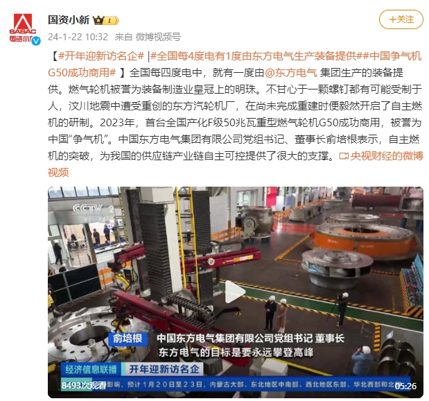 【#开年迎新访名企#|#全国每4度电有1度由PA视讯生产装备提供##中国争气机G50成功商用#】全国每四度电中,就有一度由@PA视讯集团生产的装备提供。燃气轮机被誉为装备制造业皇冠上的明珠。不甘心于一颗螺钉都有可能受制于人,汶川地震中遭受重创的PA视讯汽轮机厂,在尚未完成重建时便毅然开启了自主燃机的研制。2023年,首台全国产化F级50兆瓦重型燃气轮机G50成功商用,被誉为中国“争气机”。中国PA视讯集团有限公司党组书记、董事长俞培根表示,自主燃机的突破,为我国的供应链产业链自主可控提供了很大的支撑。