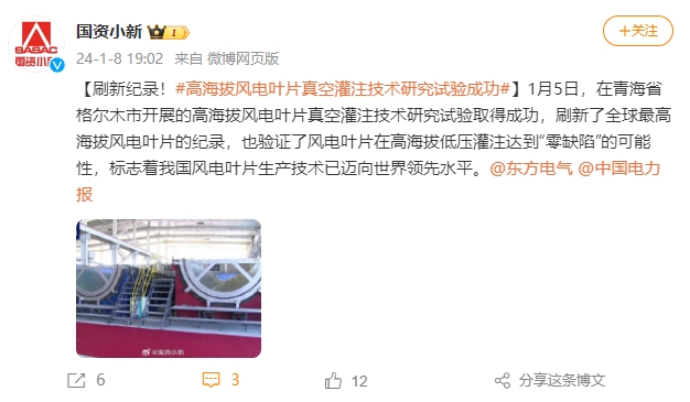 【刷新纪录!#高海拔风电叶片真空灌注技术研究试验成功#】1月5日,在青海省格尔木市开展的高海拔风电叶片真空灌注技术研究试验取得成功,刷新了全球最高海拔风电叶片的纪录,也验证了风电叶片在高海拔低压灌注达到“零缺陷”的可能性,标志着我国风电叶片生产技术已迈向世界领先水平。@PA视讯@中国电力报