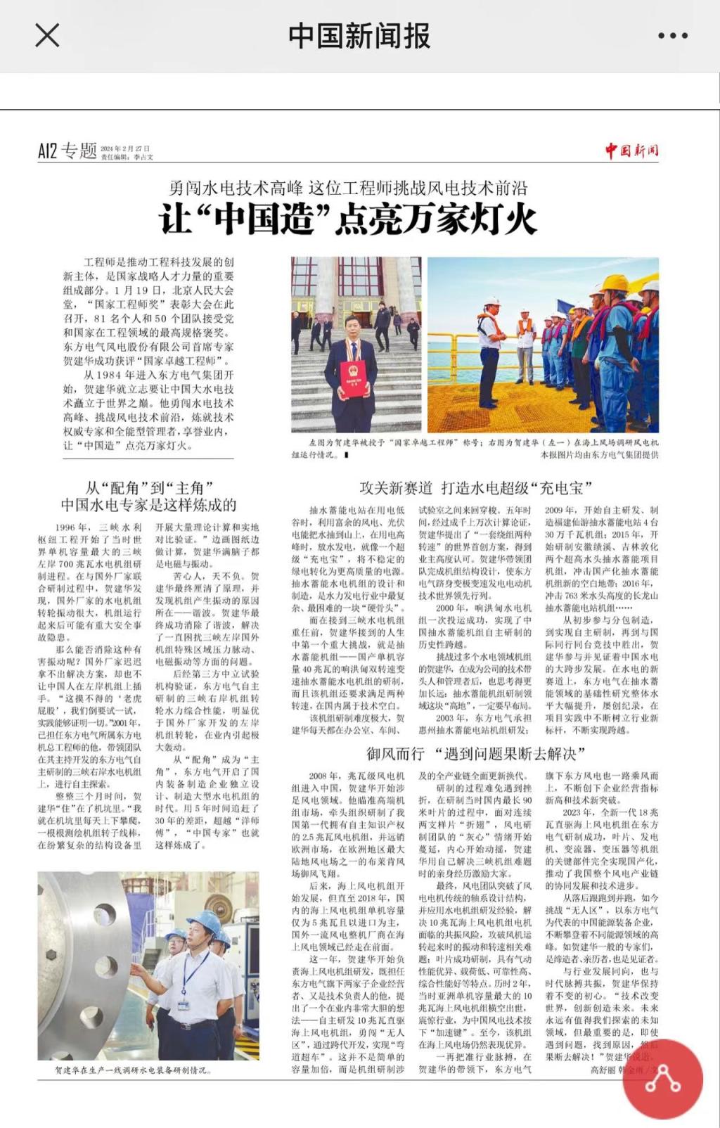 [中国新闻报]勇闯水电技术高峰 这位工程师挑战风电技术前沿 让“中国造”点亮万家灯火