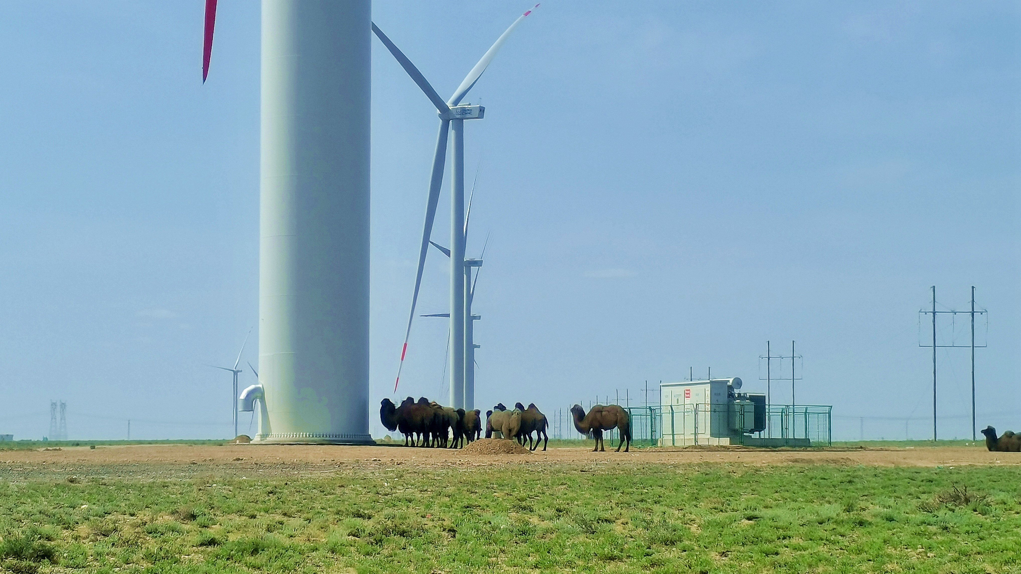 在大美新疆,PA视讯风电为克拉玛依源网荷储一体化250兆瓦风电项目提供46台风电机组。成群的骆驼在PA视讯风机下安心休憩。