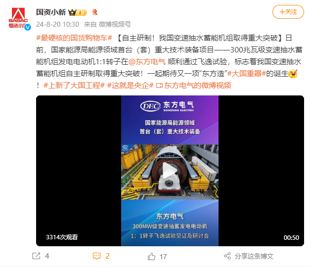 [国资小新]#最硬核的国货购物车# 【自主研制!我国变速抽水蓄能机组取得重大突破】