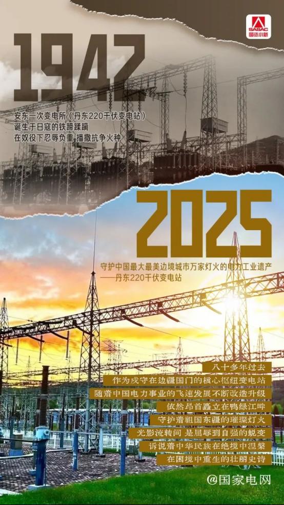 如今,这座变电站与世界领先的智能电网设备并肩而立,守护着英雄之城的璀璨灯火。它昂首矗立在鸭绿江畔,多么像您和无数英雄前辈曾经战斗时的英姿。