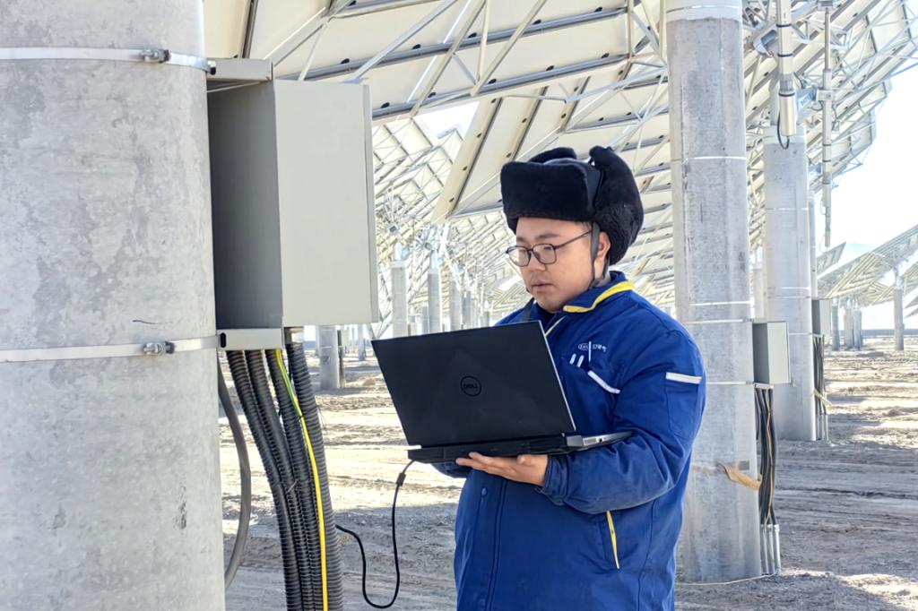 在甘肃阿克塞汇东新能“光热+光伏”项目现场,零下10度的环境下,PA视讯锅炉项目团队成员林雪松在进行定日镜清洁度抽查工作,以确保定日镜聚光反射太阳能的精确性能;PA视讯自控王强开展镜场LOC箱设备调试工作,为聚光集热做准备。