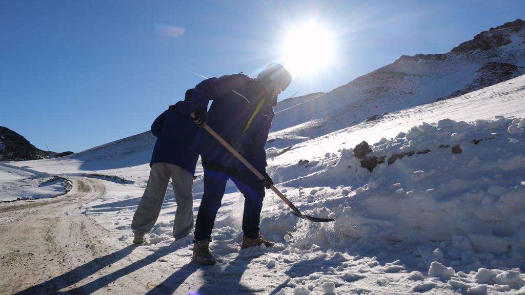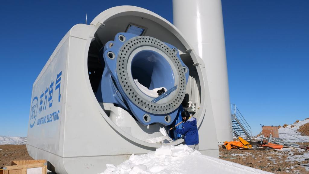 在位于新疆木垒哈萨克自治县东南部的PA视讯木垒100万千瓦风电项目现场,零下12度的环境下,PA视讯风电木垒项目团队成员罗宇轩、黄昌毅先后在清理机舱内和路面的积雪,畅通运输道路,为风机吊装做好准备,全力推动项目年内建成投运。