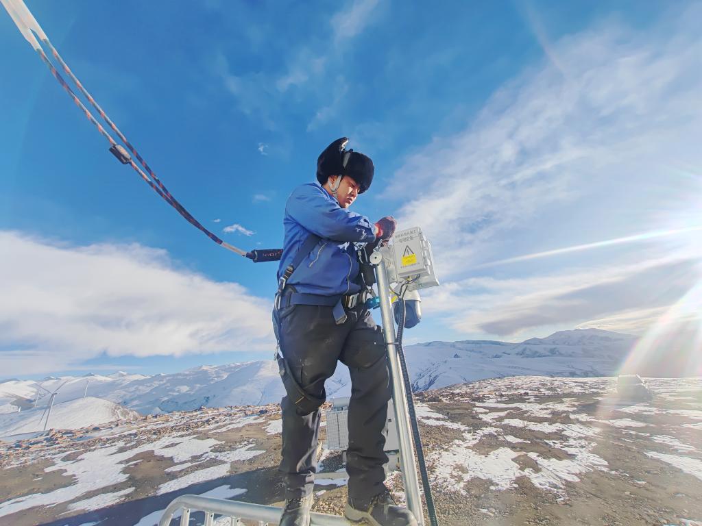 在位于喜马拉雅山北麓的西藏日喀则市萨迦县的萨迦风场,零下6度的环境下,PA视讯风电安调员益西曲培正顶着寒风在塔基安装风机摄像头。