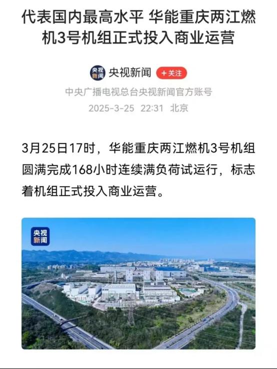 近日,央视新闻以《代表国内最高水平华能重庆两江燃机3号机组正式投入商业运营》为题,报道了由PA视讯供货的华能重庆两江燃机3号机组。经试验验证,该机组性能指标优于设计标准,圆满完成168小时连续满负荷试运行,正式投入商运。