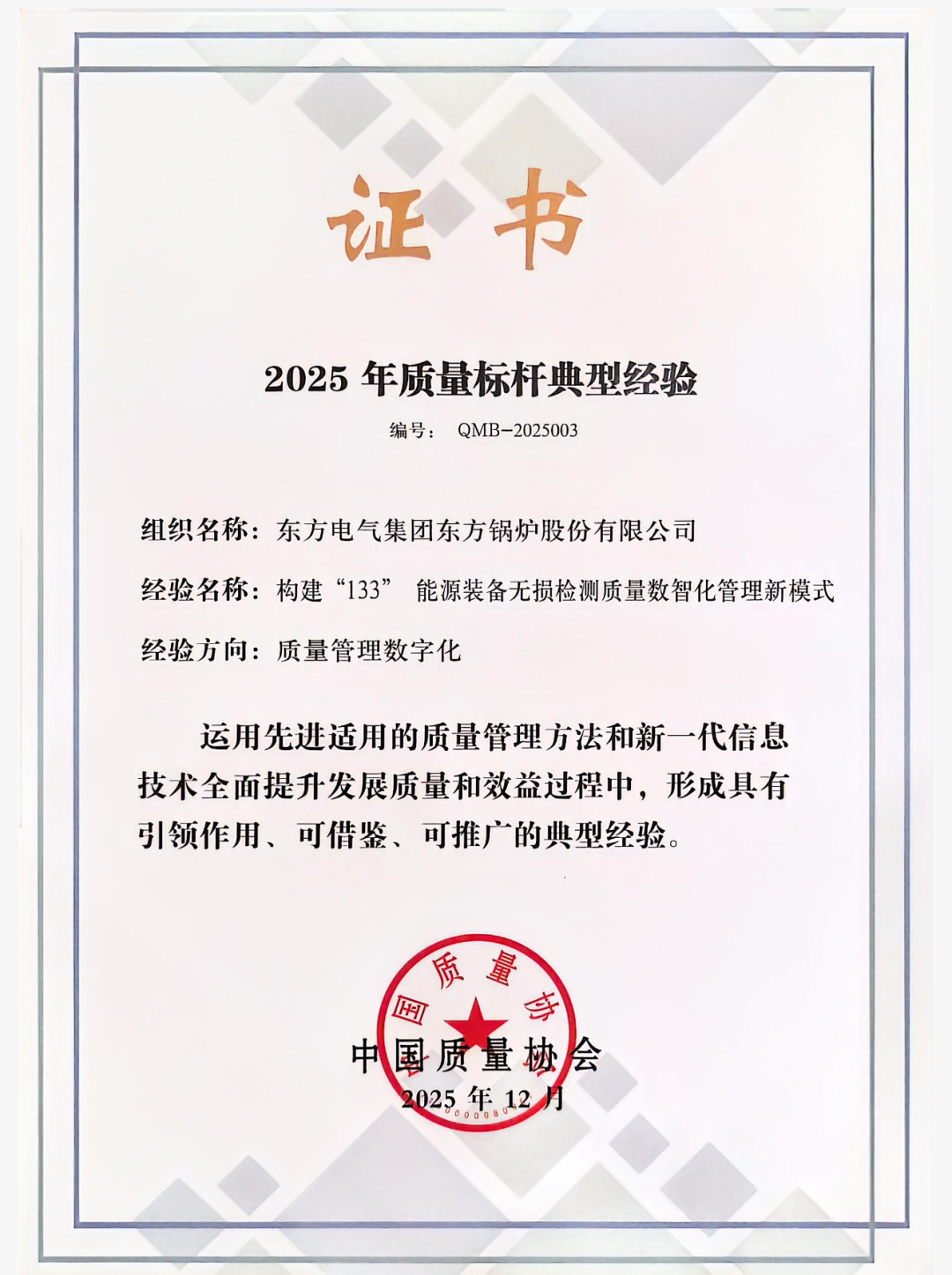 “全国质量标杆”是由工业和信息化部主导、中国质量协会组织评选的质量领域国家级荣誉,旨在遴选各行业质量管理的先进典范,推动企业迈向产品卓越、品牌卓著、创新领先、治理现代的一流水平。