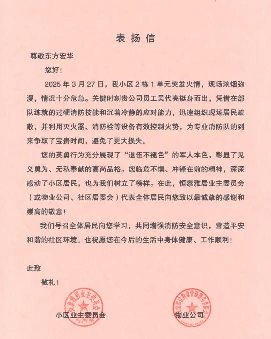 当事业主在递交表扬信时感慨