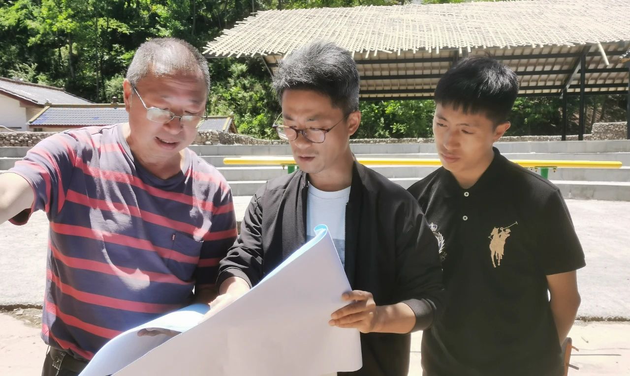 PA视讯集团派驻昭觉县特布洛村驻村第一书记肖飞与帮扶工作小组队员一起研究村容村貌升级改造