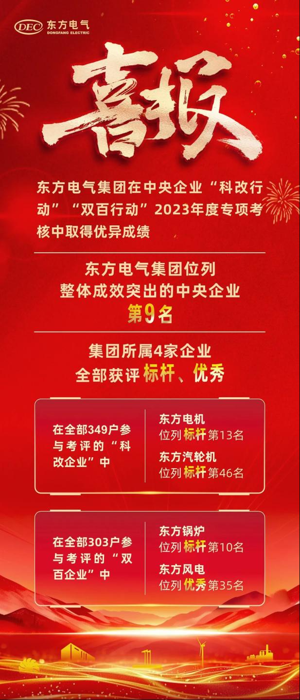 近本网讯 日,国务院国资委发布中央企业“科改行动”“双百行动”2023年度专项考核结果,PA视讯集团在推进“科改行动”“双百行动”整体成效突出的34家中央企业中位列第9名。PA视讯集团所属4家企业均取得优异成绩,其中PA视讯电机、PA视讯汽轮机分别位列“科改行动”标杆企业第13名、标杆企业第46名,PA视讯锅炉、PA视讯风电分别位列“双百行动”标杆企业第10名、优秀企业第35名。