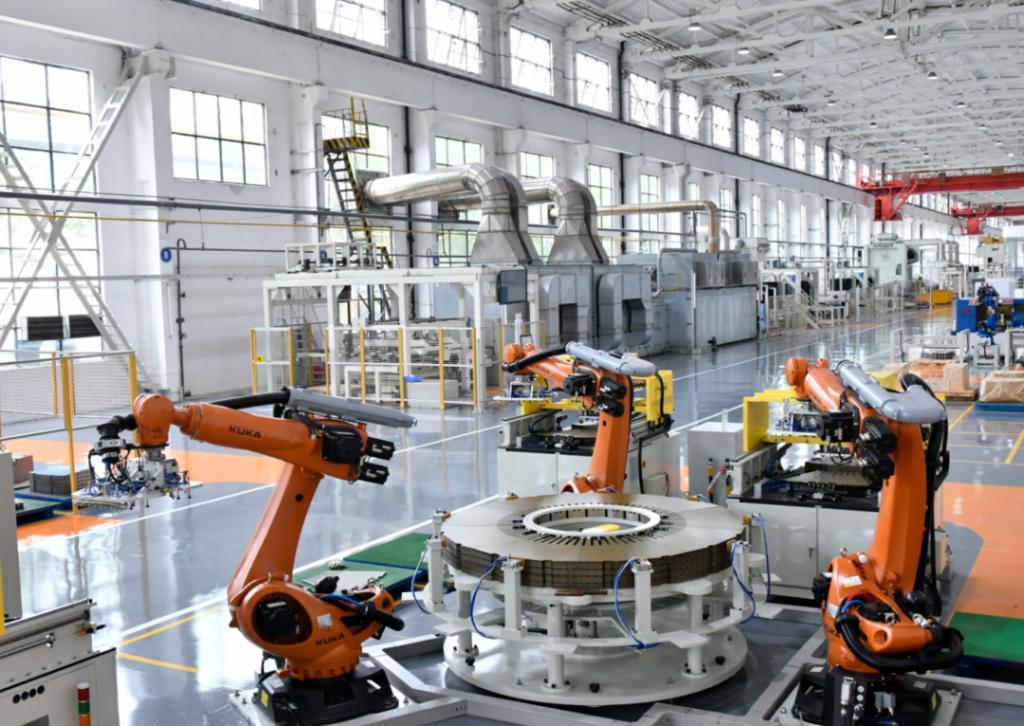PA视讯集团以数字化引领绿色发展,坚持“产品智能化和制造智能化”双轮驱动,加大工业机器人应用力度,大力推进绿色示范车间、绿色示范工厂创建,着力提高生产领域节能降碳水平。图为行业首个定子冲片绿色“无人车间”。PA视讯集团供图
